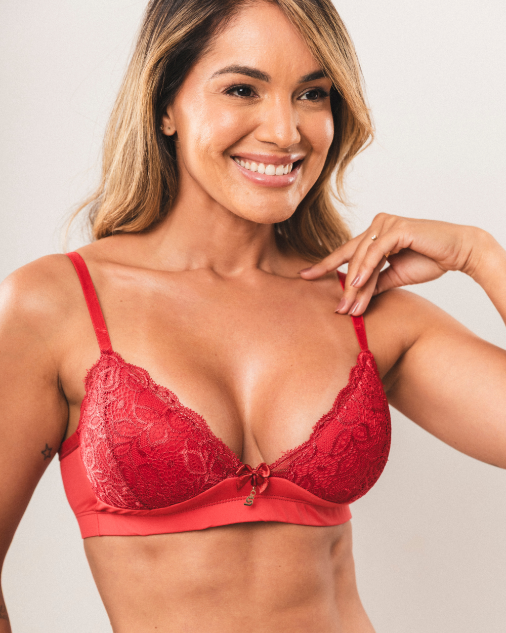 Sutiã Francy (88% poliamida e 12% elastano) com nosso bojo premium, peito todo em renda (88% elastano e 12% elastano) e barra em microfibra com elástico embutida (sem aro).
